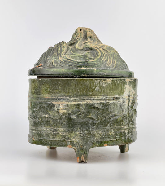 A GREEN-GLAZED POTTERY TRIPOD 'HILL' JAR, HAN DYNASTY, 206 BC - 220 AD