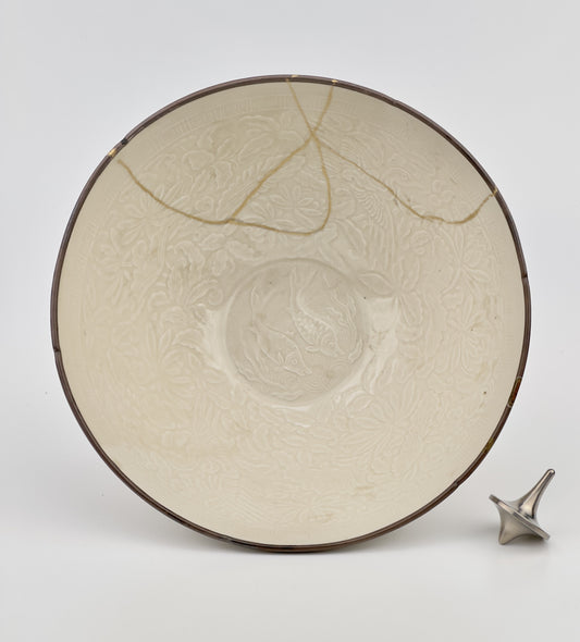 A RARE MOULDED DINGYAO 'CRANES AND FISHES' BOWL, NORTHERN SONG - JIN DYNASTY