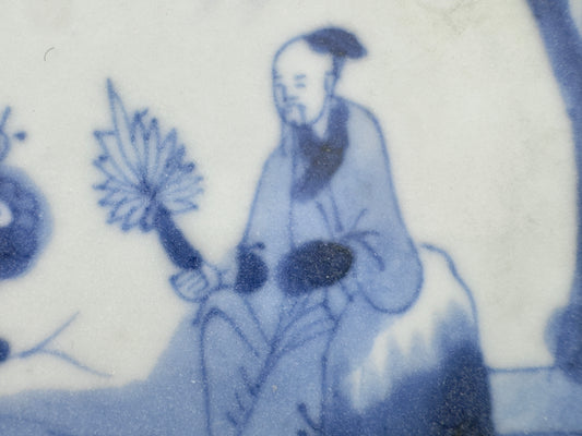 A SCHOLARLY REPOSE BLUE AND WHITE SAUCER CIRCA 1725, QING DYNASTY, YONGZHENG REIGN