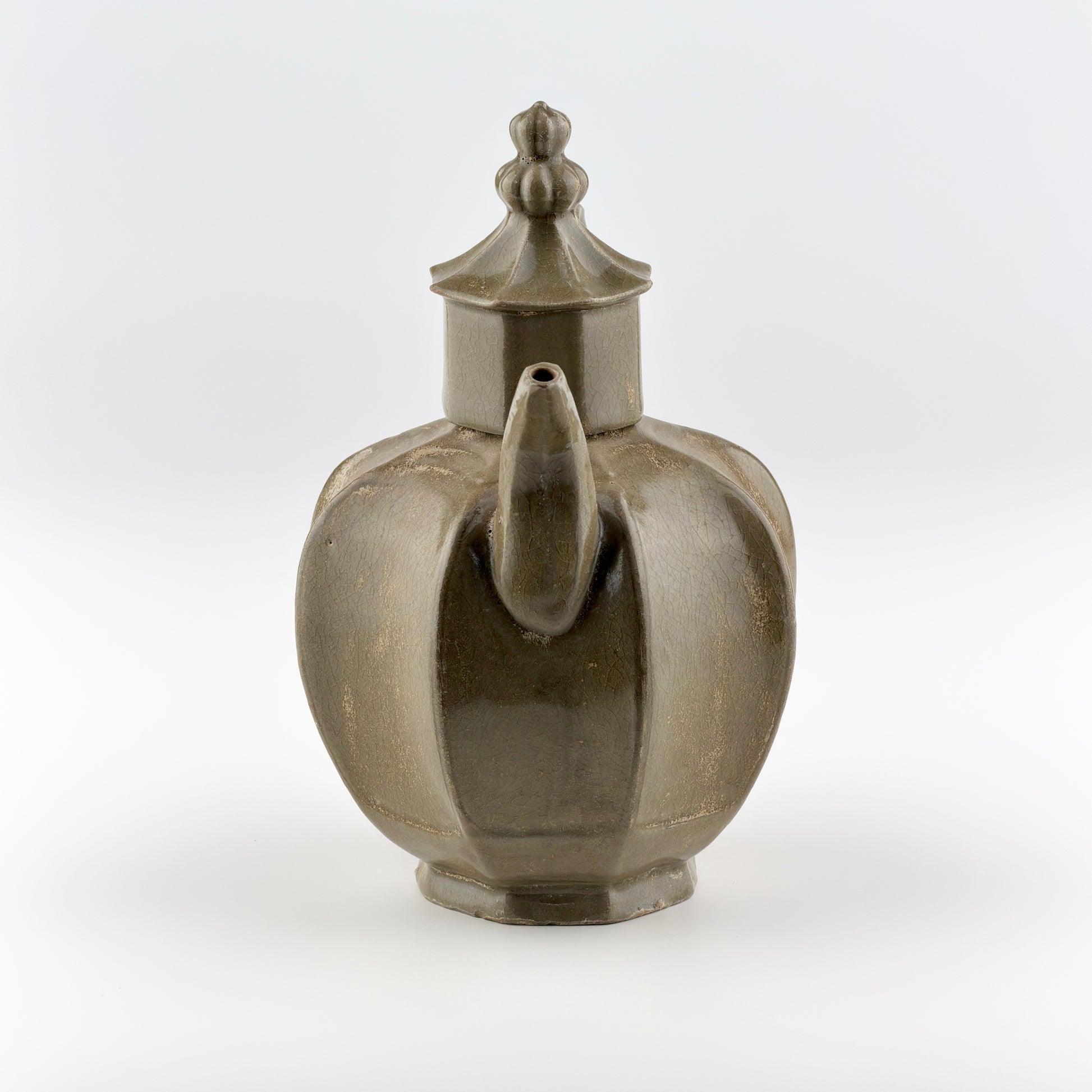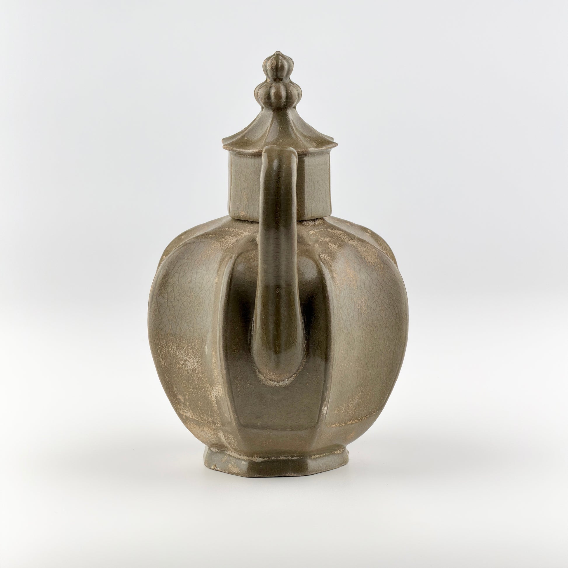 This olive-brown celadon ewer features an octagonal lobed body, a tall curved spout, loop handle, and a domed cover with a bud-shaped finial. The olive glaze is suffused with fine crackles. The unglazed foot reveals the dense buff body, while additional oxidation traces and surface alteration confirm extended age and burial conditions.