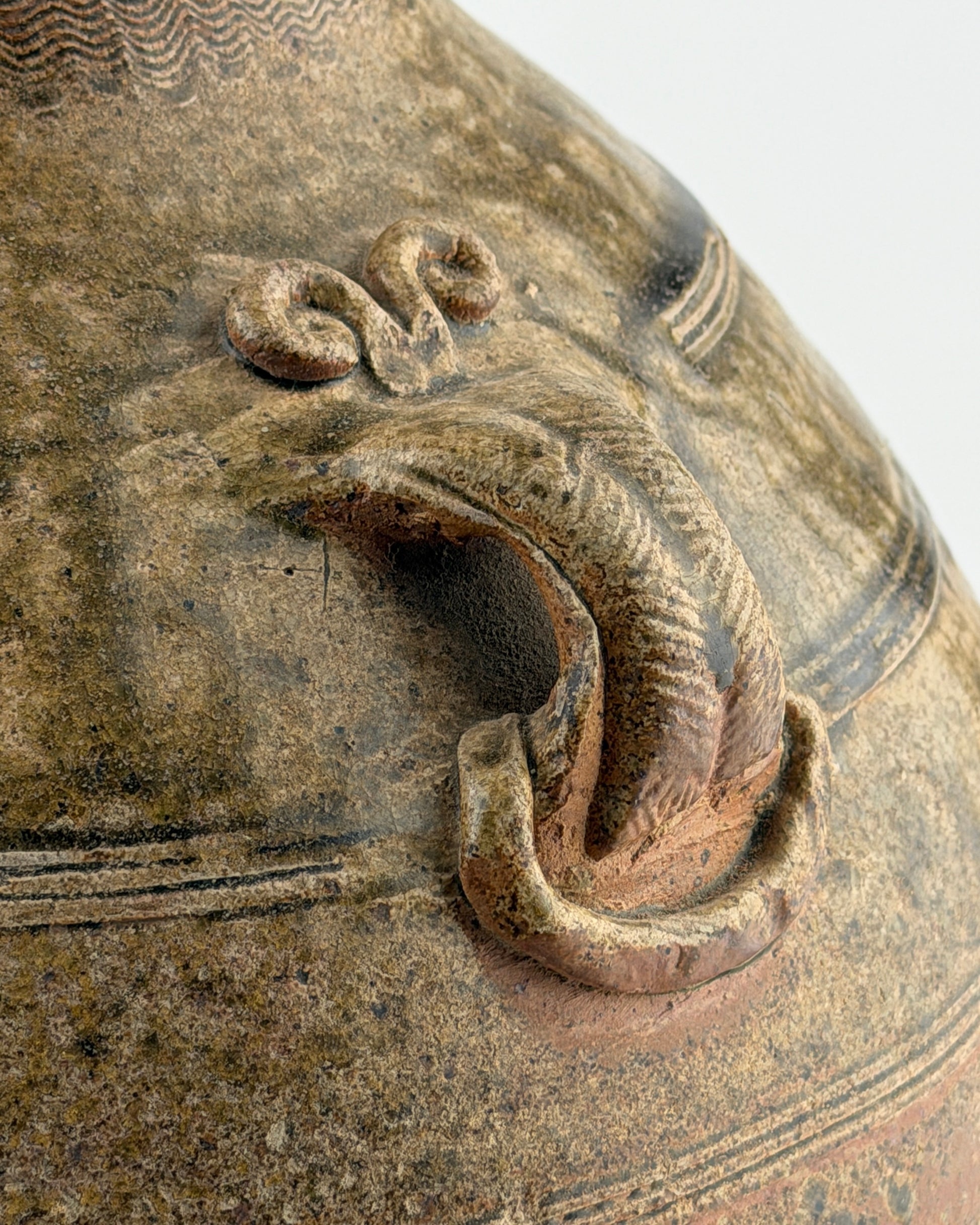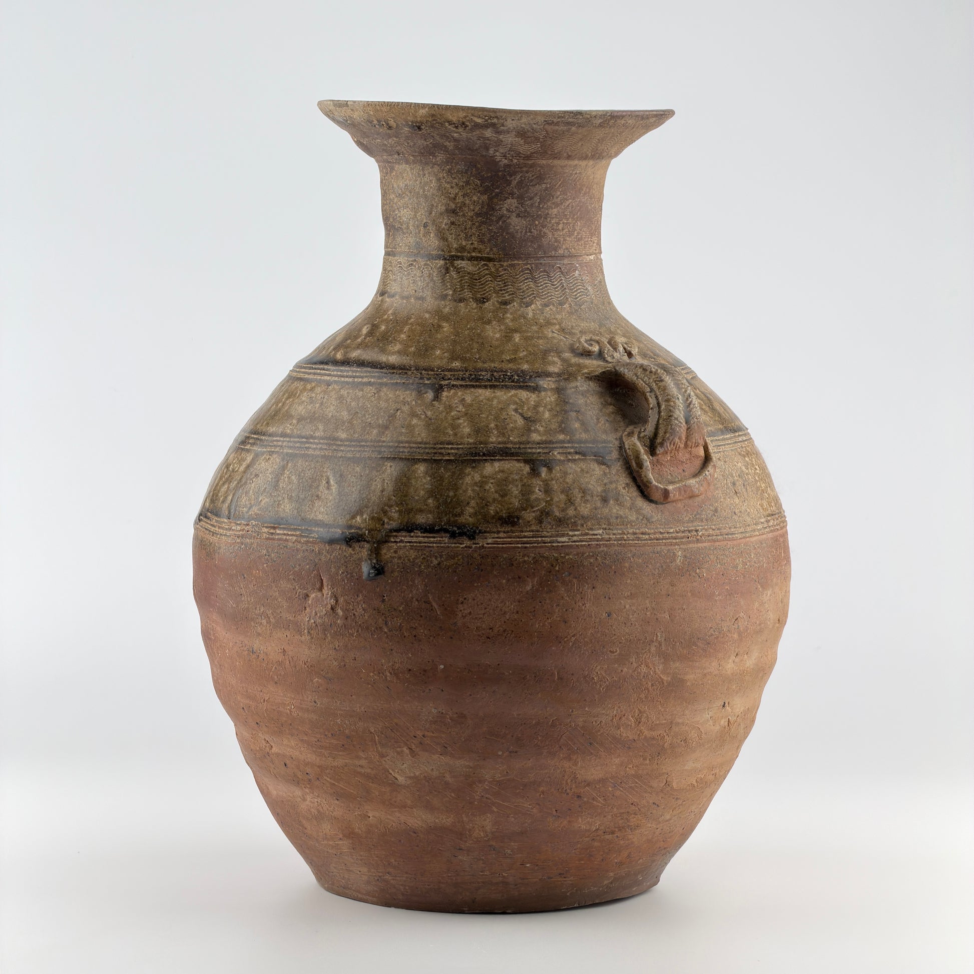 Ovoid form escalating to a cylindrical neck with a flaring rim, adorned at the shoulder with three narrow grooved horizontal bands. Each side is equipped with an incised double-loop handle, culminating in an ornate scroll motif at the top and a fluted ring at the bottom. Wave patterns are meticulously incised along the neck and rim. The upper portion of the body and the inner rim are enveloped in a translucent olive-green glaze.