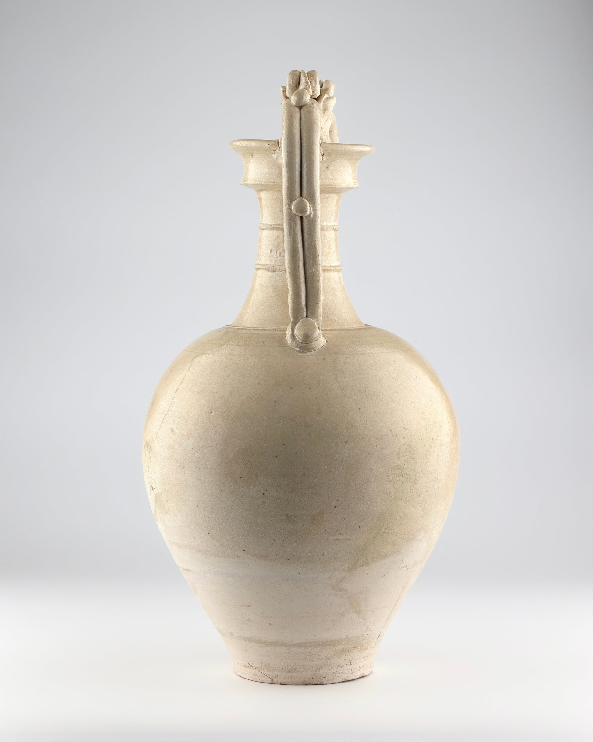 A pair of double-strap 'dragon' handles applied with bosses that rise from the rounded shoulder and terminate in a dragon head biting the rim, and is covered with a finely crackled straw glaze.
