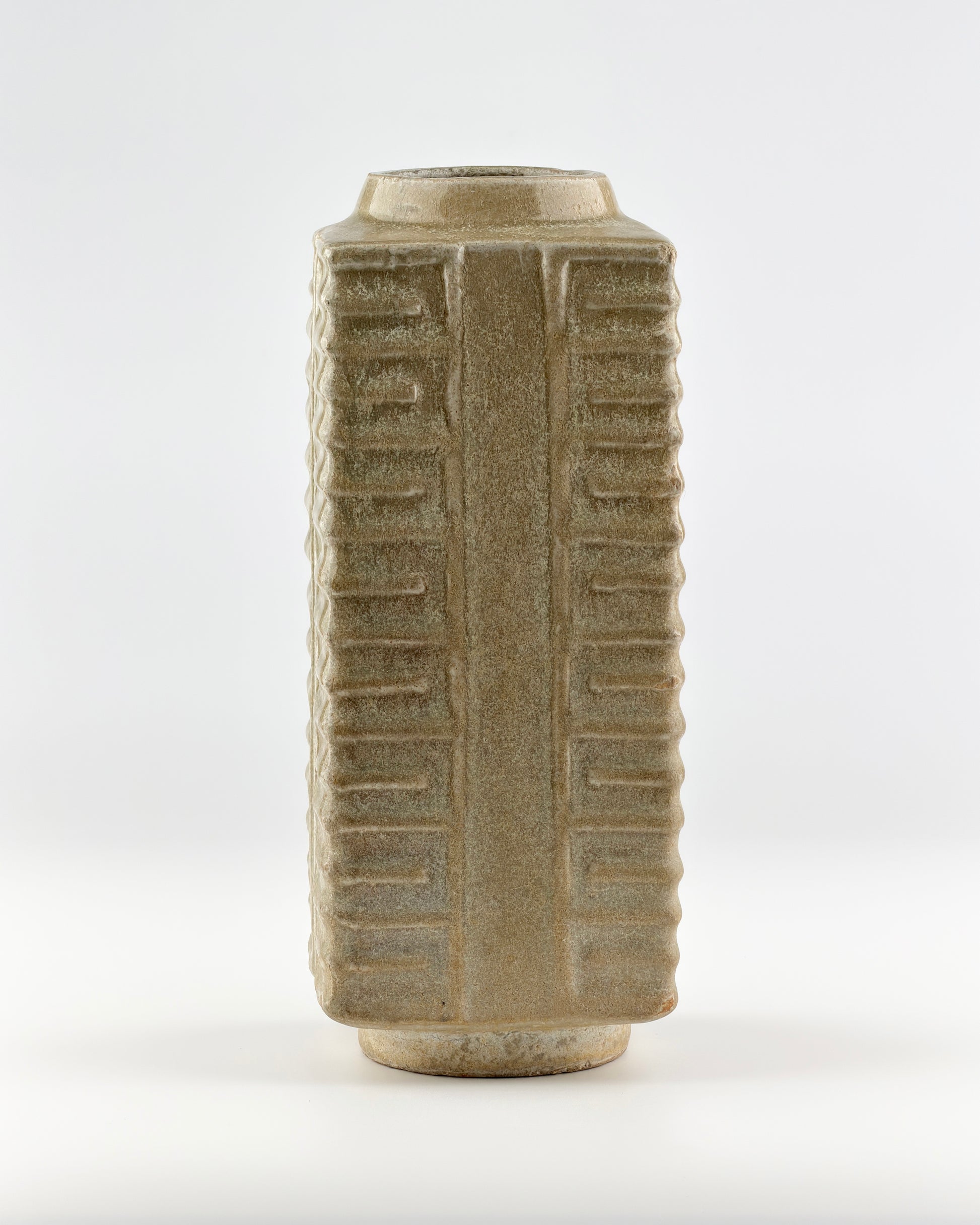 The vessel is constructed with a cylindrical inner structure and a square outer profile, conforming to the characteristic geometry of the ancient Cong (琮) form. Its surface is decorated with restrained geometric incised patterns. This structural concept is directly derived from ancient jade Cong (玉琮), which represent the earliest and most authoritative prototypes of the form. Jade Congs dating to approximately 2500 BCE are well documented, with important examples preserved in the collections of the British Museum and the Metropolitan Museum of Art (MET). These jade works establish the formal lineage upon which later Cong-shaped ceramics were developed.
