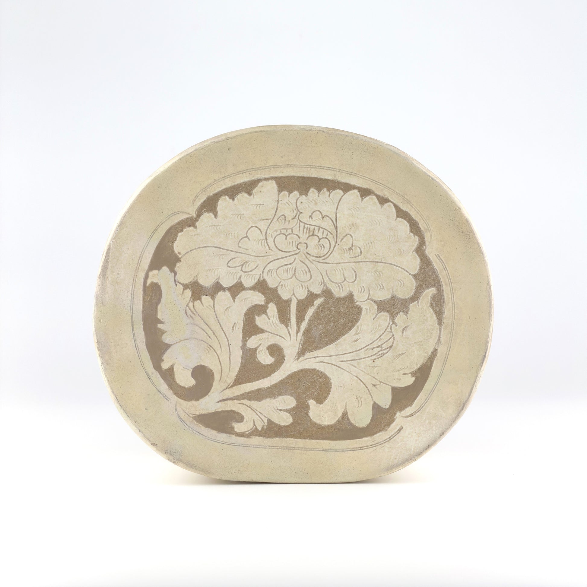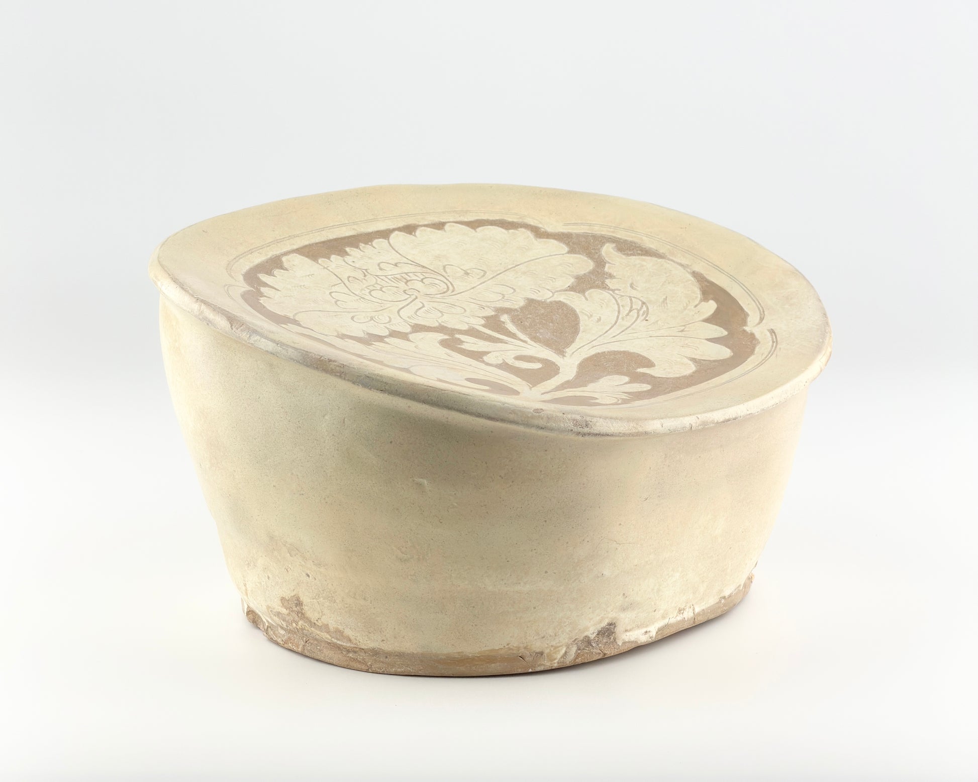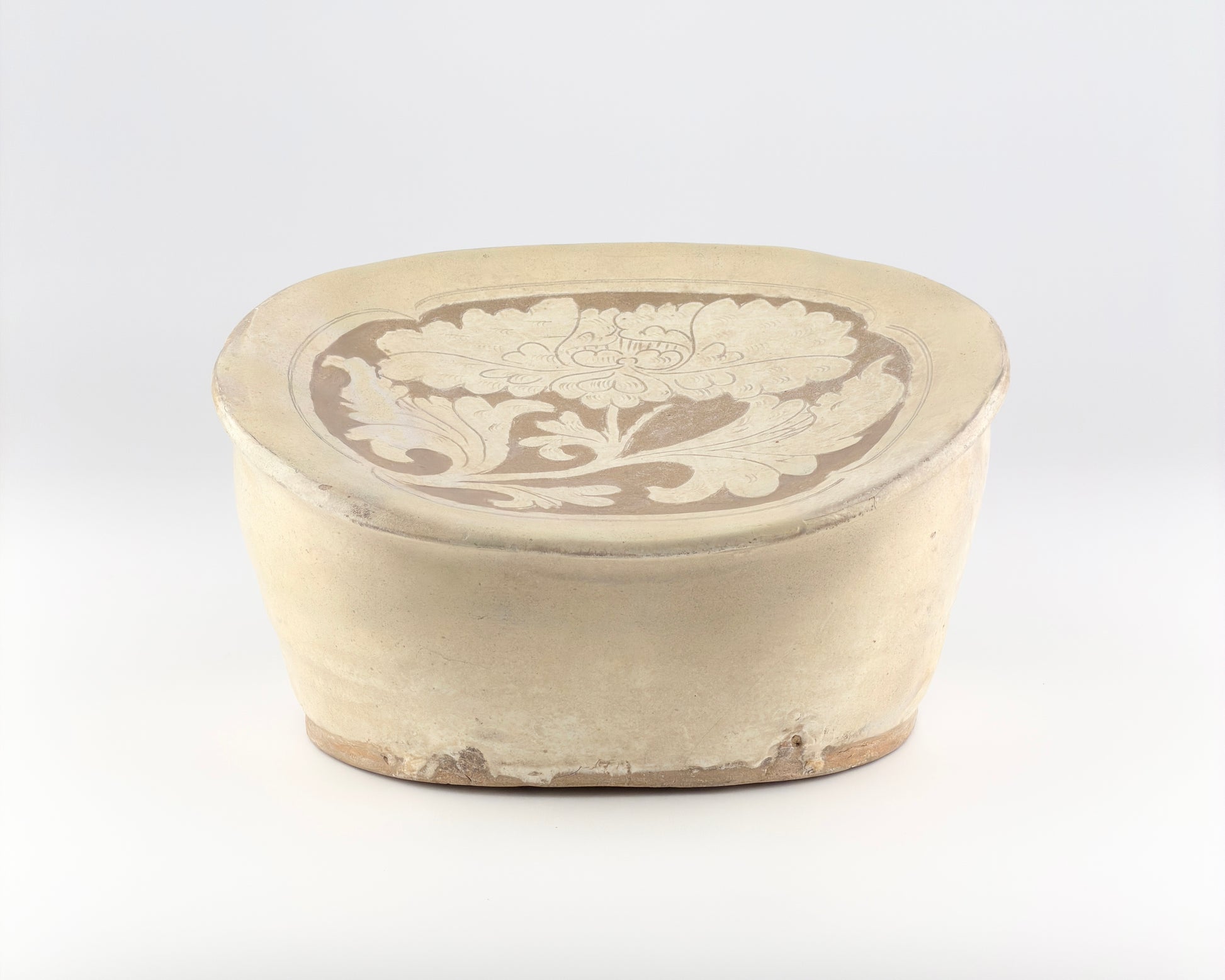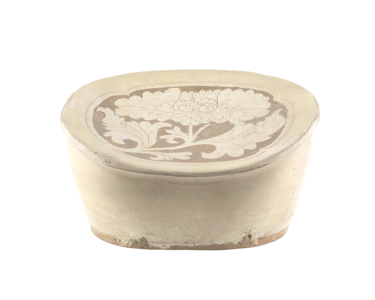 This pillow was produced by applying a white slip over a refined clay body and subsequently carving the decorative motifs. The floral design incised on the surface is symmetrically composed yet animated by a natural sense of rhythm, while the carving reveals the darker clay body beneath, creating a pronounced visual contrast. This decorative approach employs the carved, sgraffito-related techniques commonly observed in Cizhou wares, reflecting the free and expressive aesthetic sensibility and pictorial qualities associated with the northern folk kilns of the Song–Jin period.