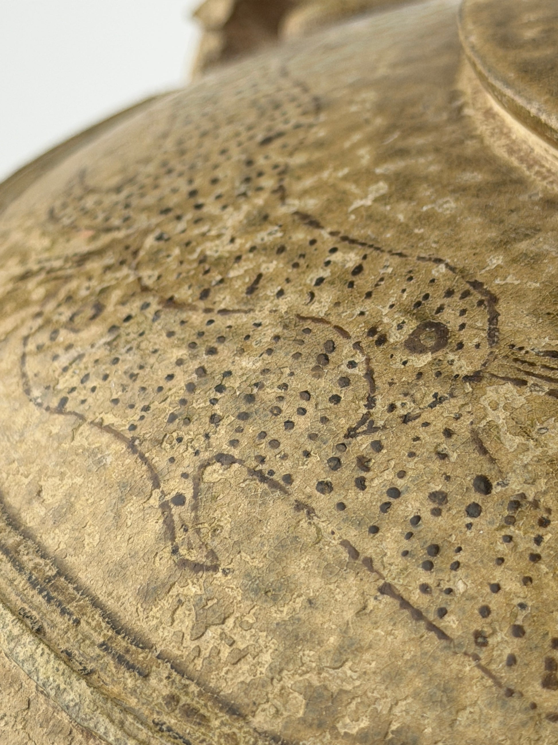 Han Dynasty pottery, originating from one of China's most significant historical periods (202 BCE – 220 CE), is renowned for its technological and artistic achievements in ceramic production. These artifacts typically feature a distinctive green glaze, although other colors were also used. The pottery often includes intricate decorative motifs, such as animals, mythological figures, and geometric patterns.