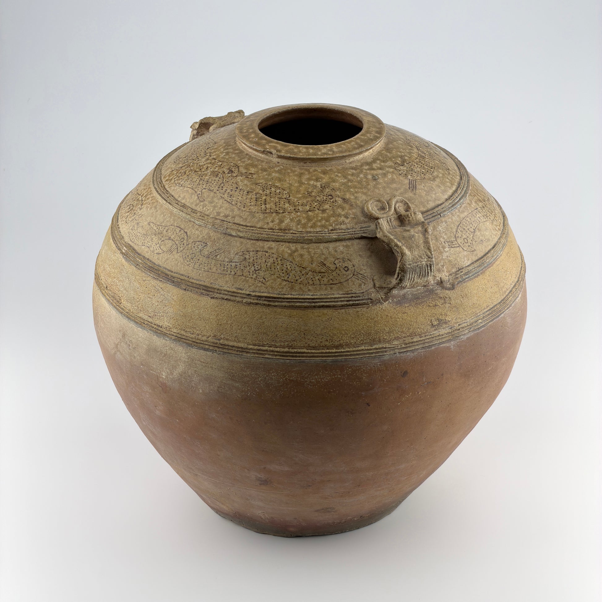 Robustly crafted with a voluminous spherical body and a layered mouth rim, this jar features a pair of taotie handles. It is adorned with three horizontal bands on the upper half of the olive-green-glazed body, which segment the glazed area into three distinct parts. The top section boasts an incised wave pattern, while the unglazed lower body presents a light brown hue.