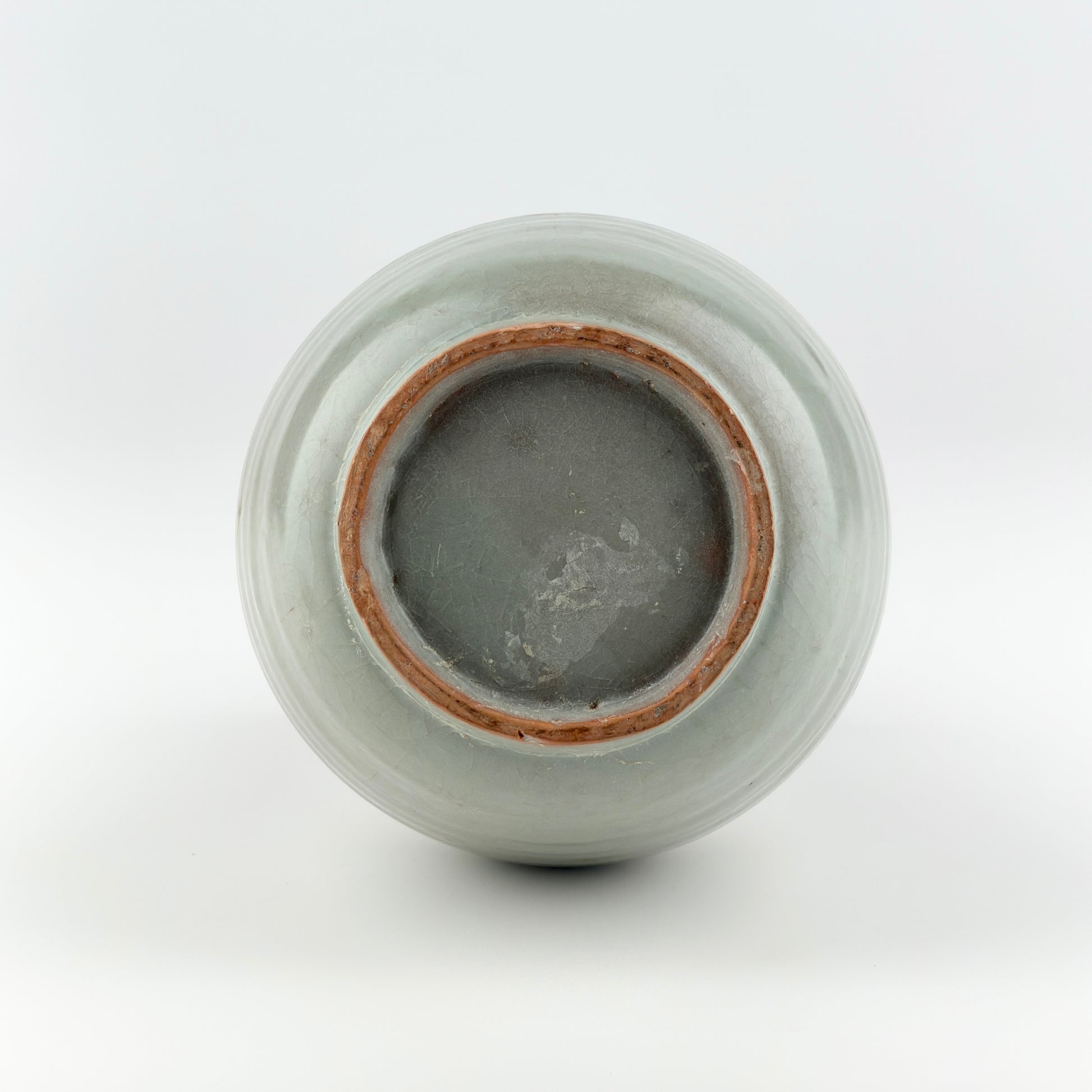 The surface is evenly coated with a transparent bluish glaze, densely covered with fine, naturally developed crackle throughout. Subtle tonal variations and discoloration across the glossy surface indicate long-term natural oxidation and gradual interaction between the glaze and underlying clay body. The unglazed foot reveals a characteristic reddish firing ring.