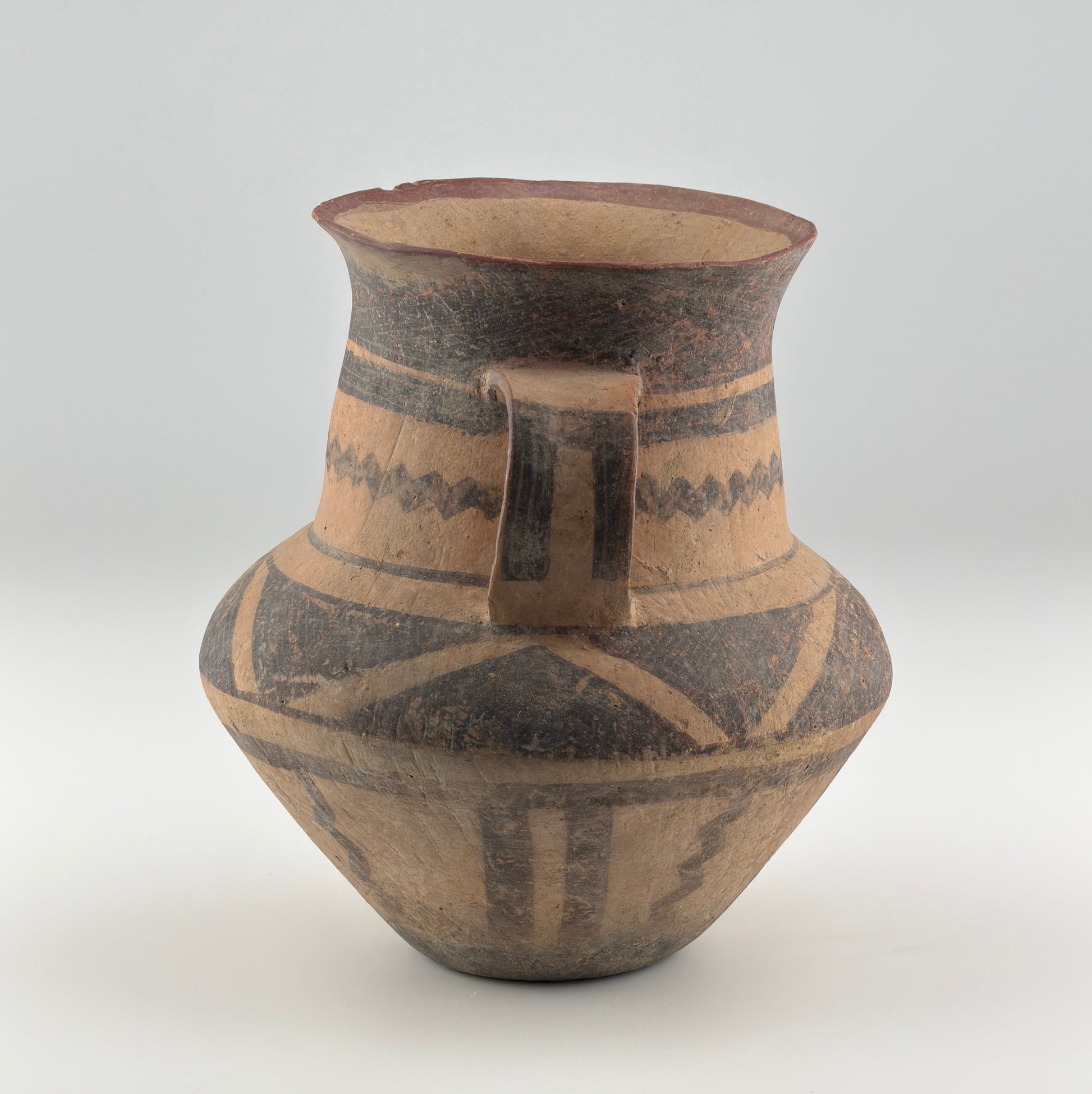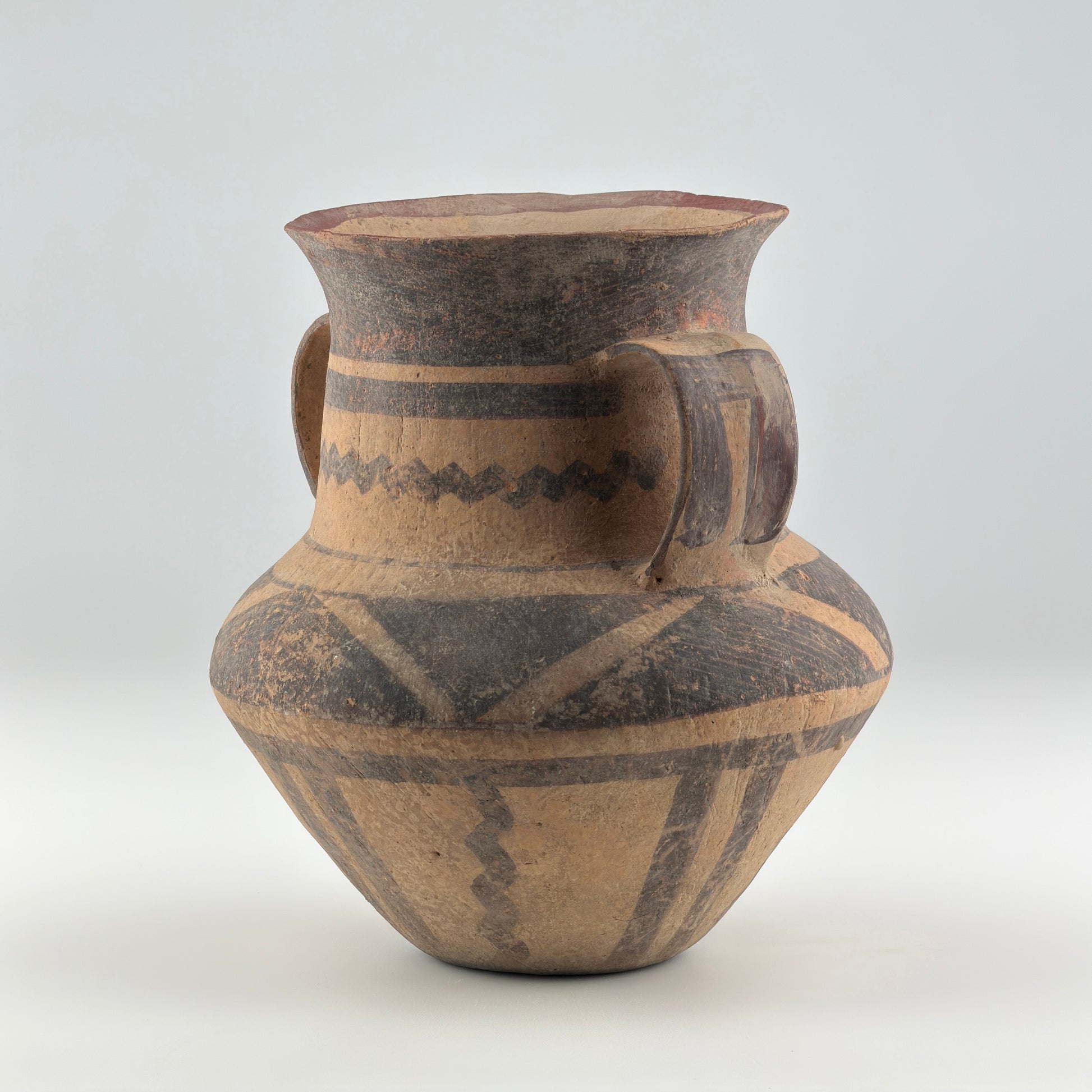 Neolithic Vase with raised neck, slightly flared, two handles. Geometric designs and stylized bovine heads in black. Acquired in Hong Kong in the late 1990s.