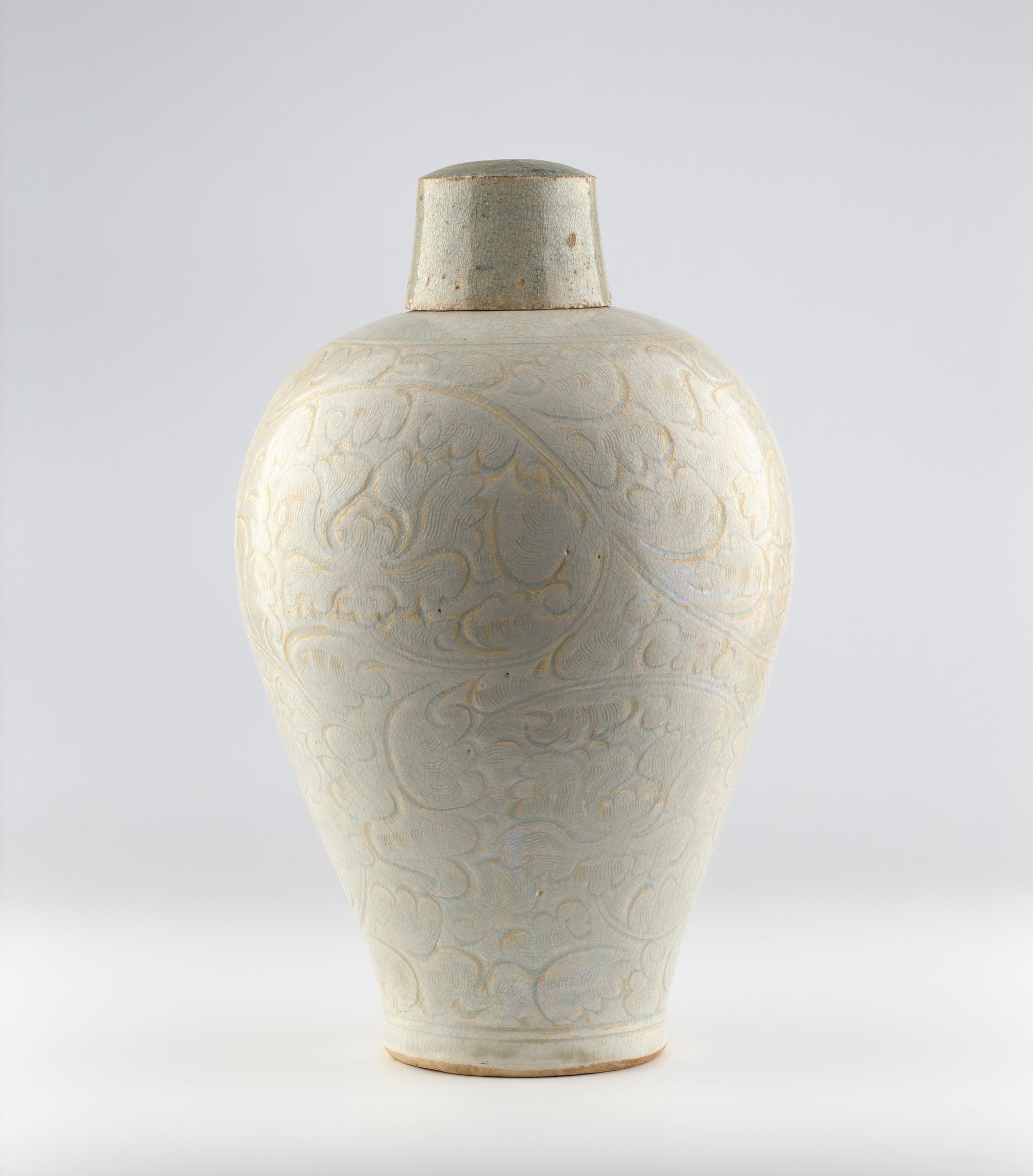 The vase features broad shoulders and a tapering body. Its surface is finely carved with scrolling foliage and lotus motifs, accentuated by precise incised lines beneath a soft bluish glaze. Under light, a subtle iridescent sheen appears across the surface, highlighting the age of the glaze.