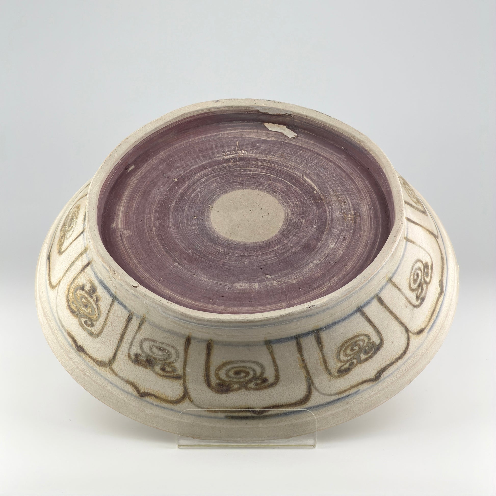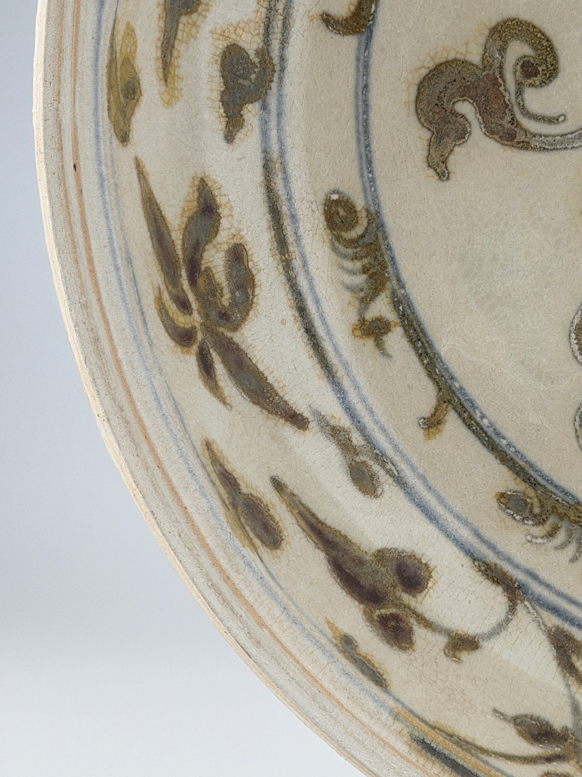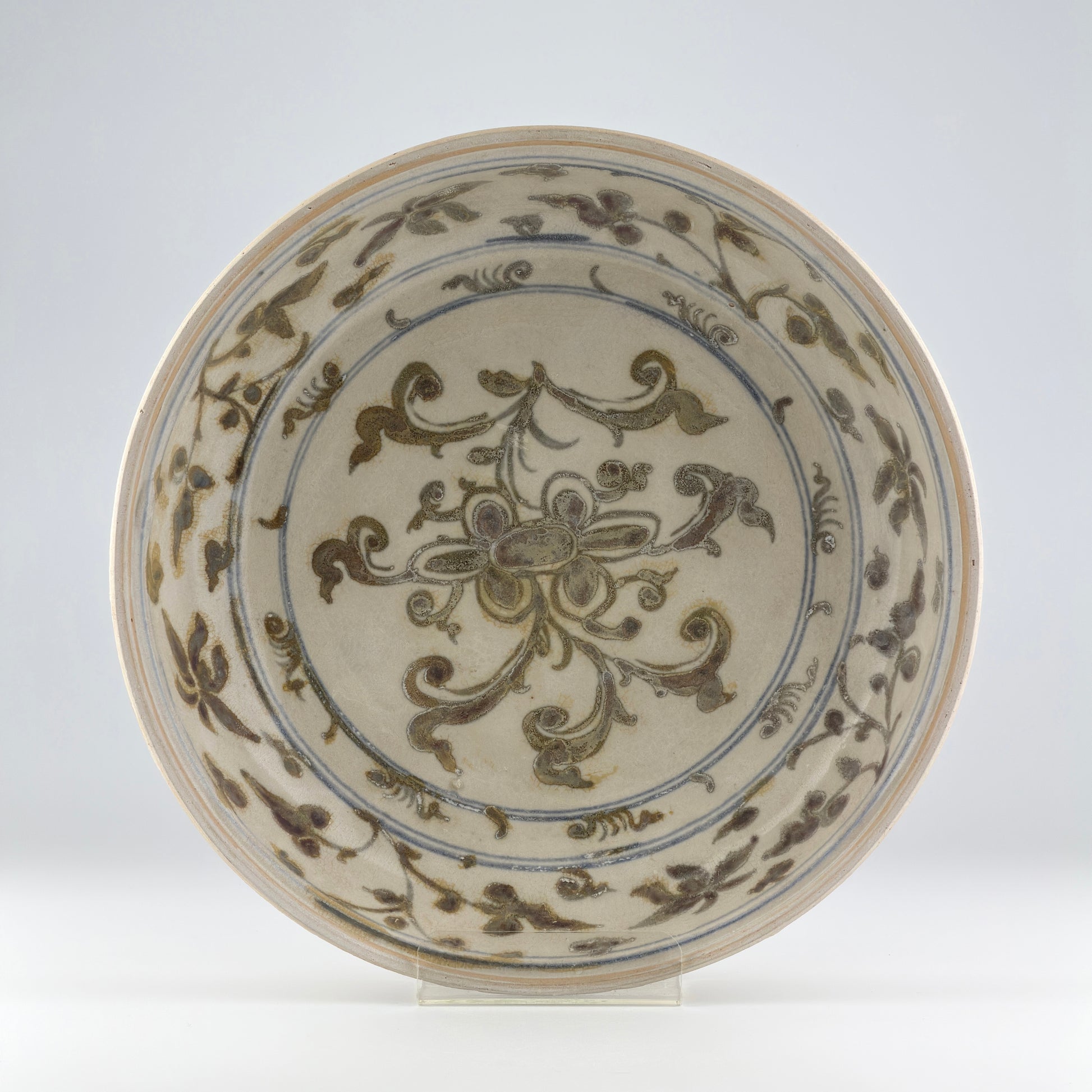 A rare brown colored stoneware dish with a central floral motif, likely a lotus, which is a recurrent symbol in Asian art representing purity and beauty. The design's fluidity and organic shapes suggest it was painted by a skilled artisan, making it a fine example of the artistry from the period when it was created.