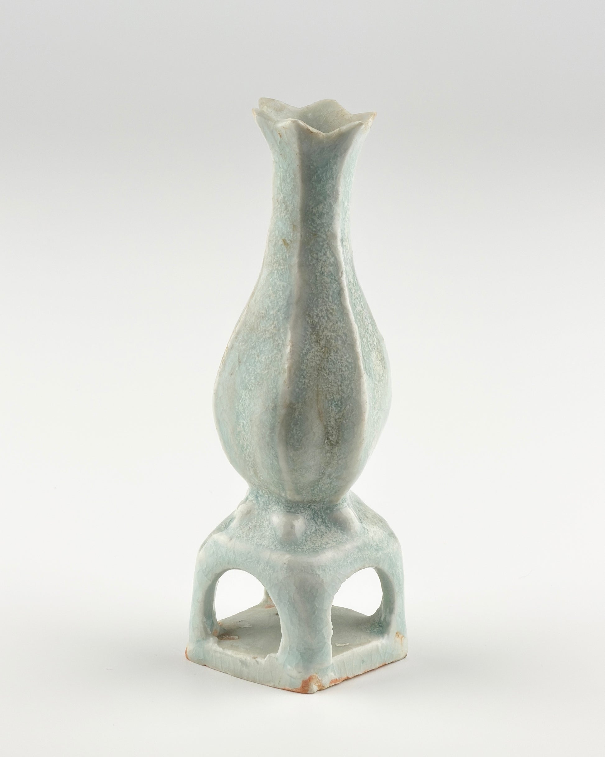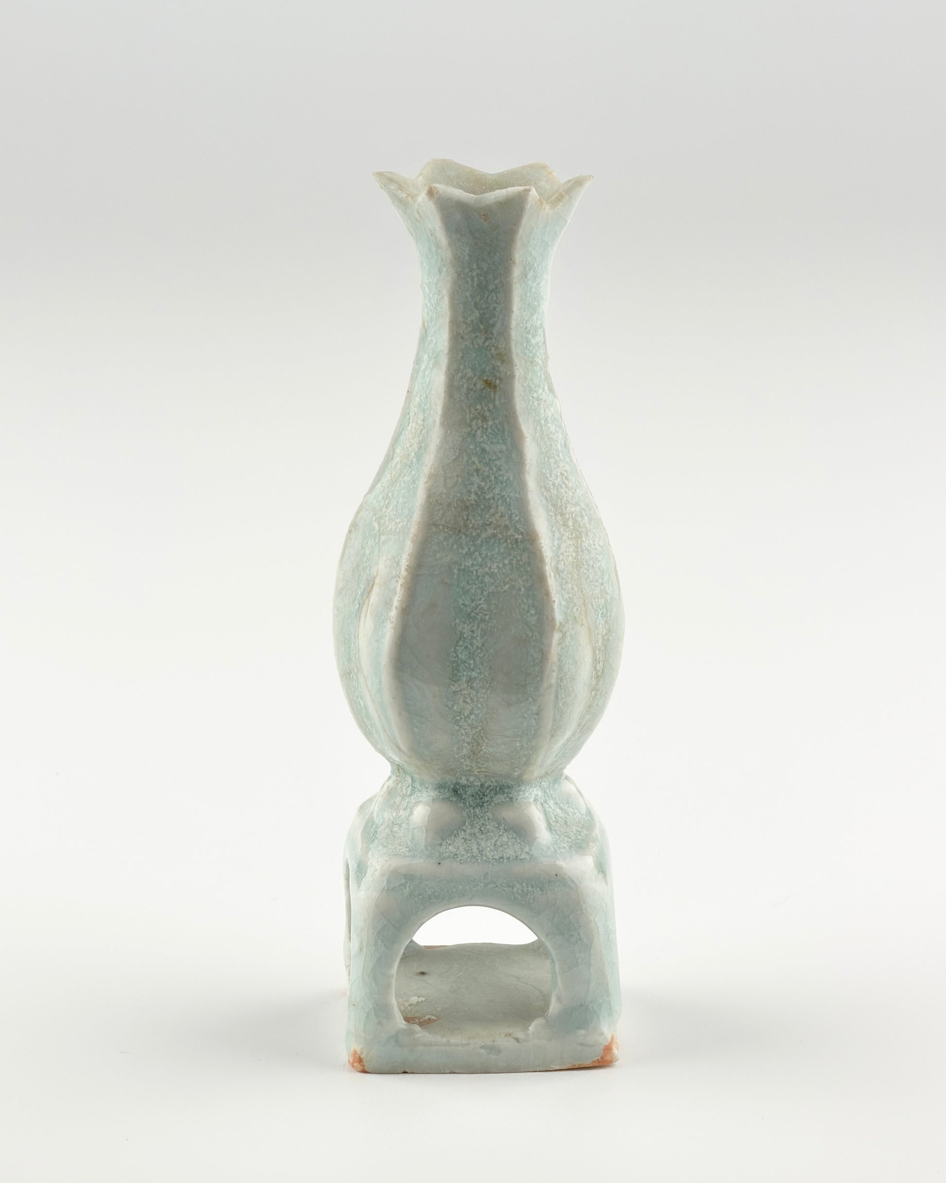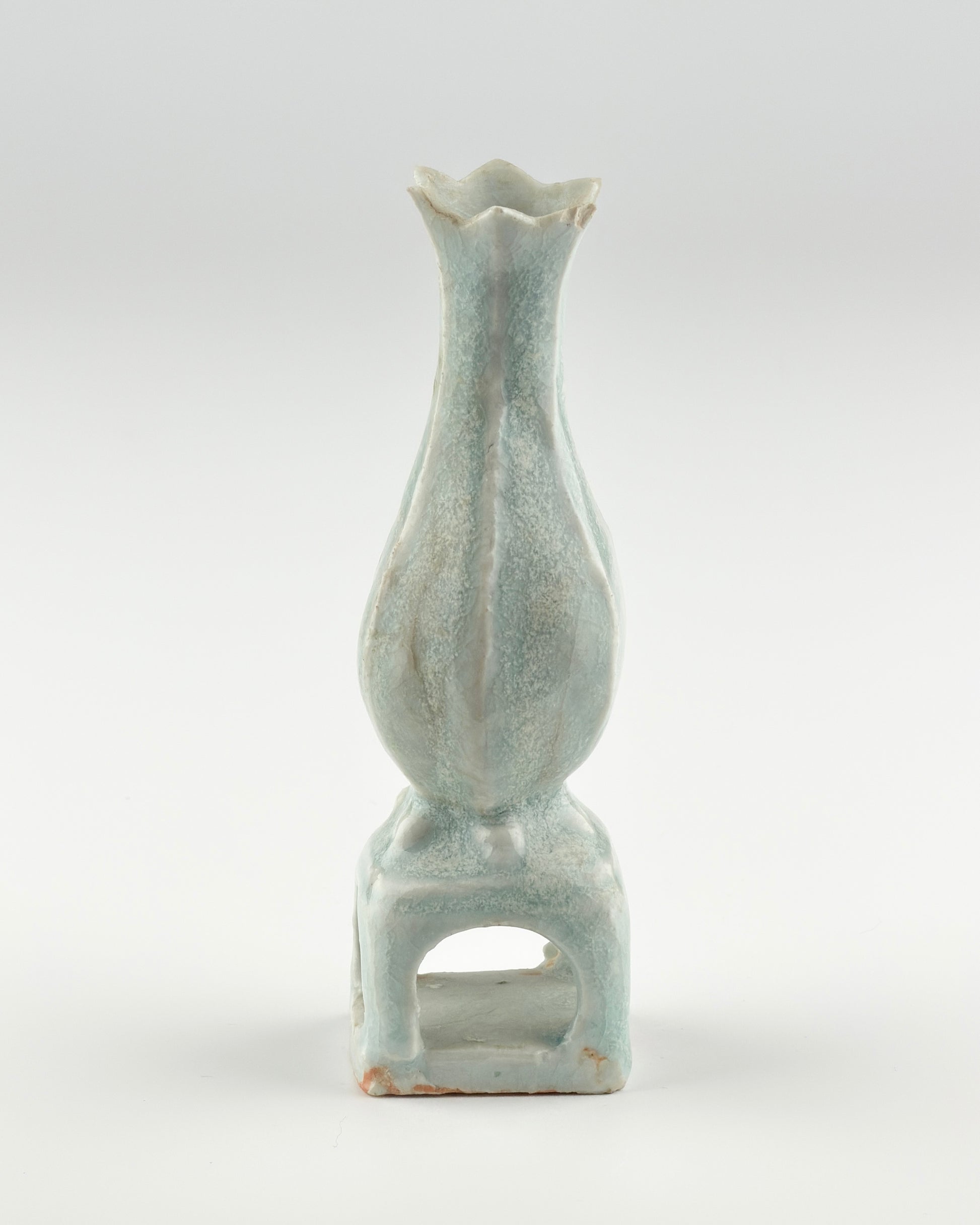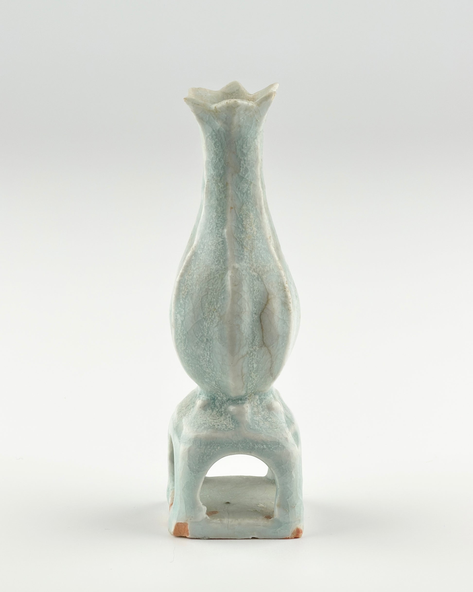 This exquisite piece is a Qingbai ware from the Song to Yuan dynasty, and it appears to be an excavated artifact given its earthy encrustations, suggesting it has rested in the ground for a lengthy period. Despite this, the piece retains its signature Qingbai glaze, which is characterized by its luminous, pale blue hue. The vase itself has a graceful, elongated neck flaring gently at the mouth, reminiscent of a blooming flower. Standing on a squared, hollow base that gives it a distinctive silhouette, the vase demonstrates the elegant simplicity and refined craftsmanship of the period.