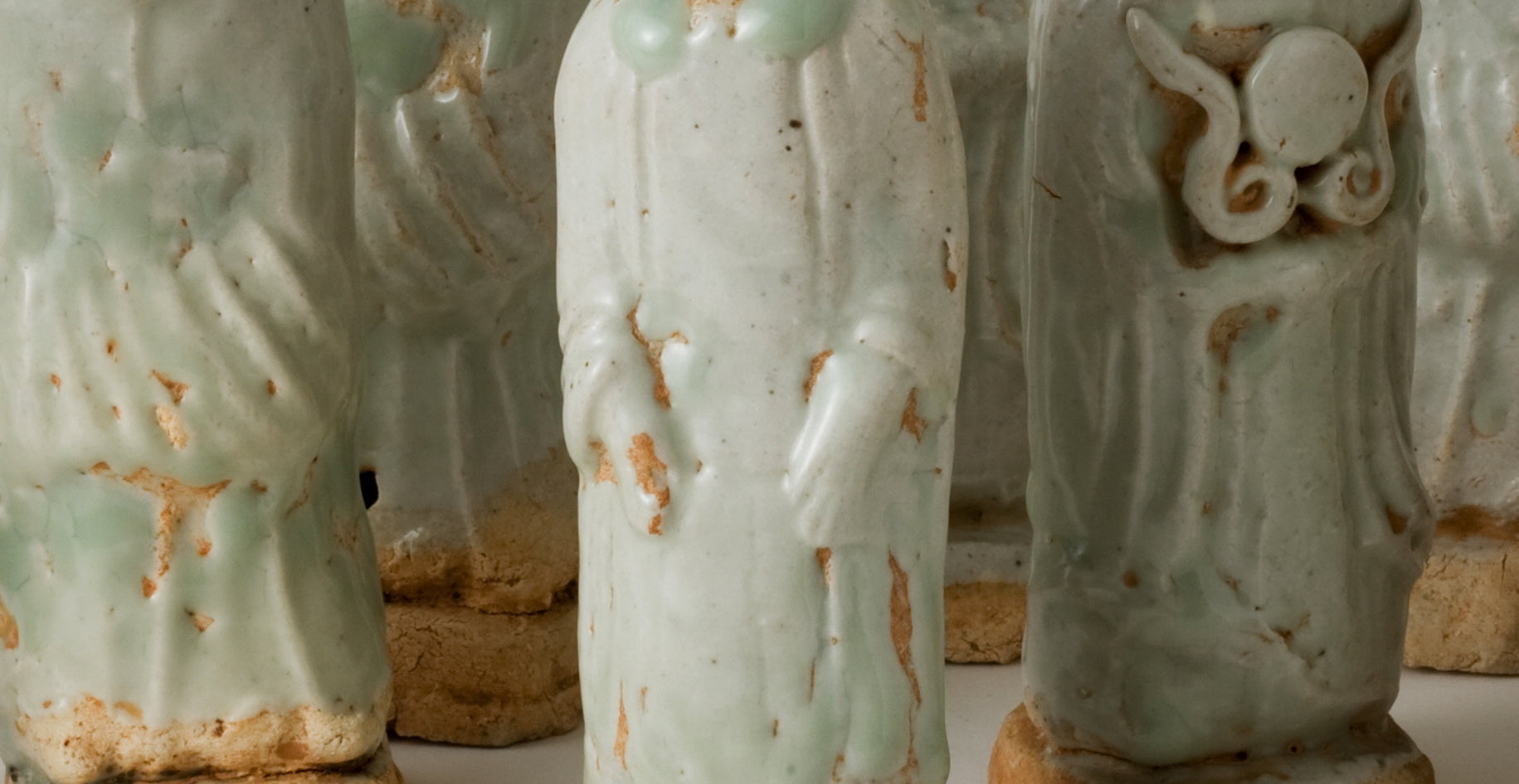This work is a group of Qingbai (青白磁) porcelain figurines produced during the Five Dynasties to the Northern or Southern Song period (10th–13th century). A transparent glaze is applied over the white clay body, creating a subtle bluish tone. The figures, wearing official caps and long robes, form a set that symbolically represents attendants or civil officials serving the deceased in funerary rites. Traces of glaze flaking and oxidation on the bases indicate that these are excavated pieces. It is particularly rare for a complete group of Qingbai figurines to survive together, which greatly enhances their scholarly and exhibition value.
