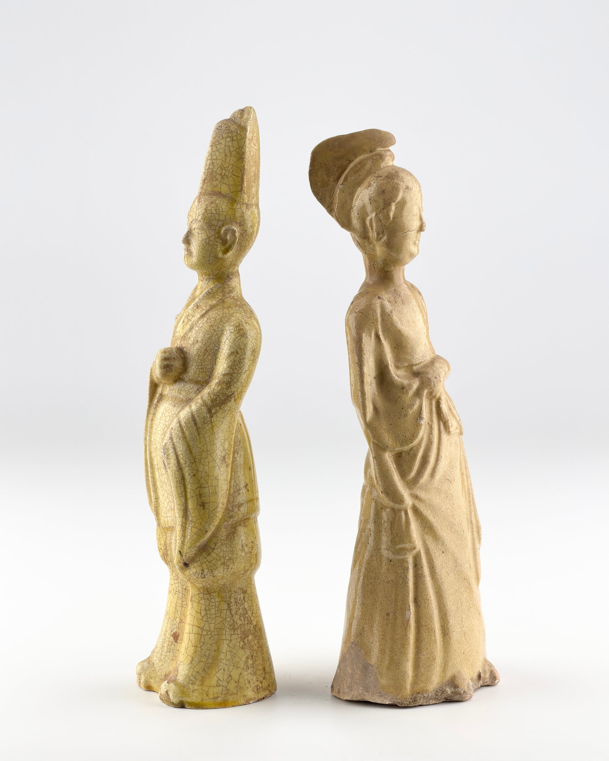 This pair of straw-glazed pottery figures represents a male and female court attendant, both elegantly attired in period fashion. The female figure wears a flowing robe with draped folds and a high-stylized coiffure, while the male figure dons a long robe and a tall, pointed headdress, suggesting official status. Their serene expressions and poised stances reflect the refined aesthetics of the Sui-Tang period. The straw glaze gives a warm, translucent yellowish tone, with the male figure exhibiting a fine craquelure pattern due to age. Despite minor surface wear, cracks, both figures remain well-preserved, exemplifying the craftsmanship of tomb figurines from this era.
