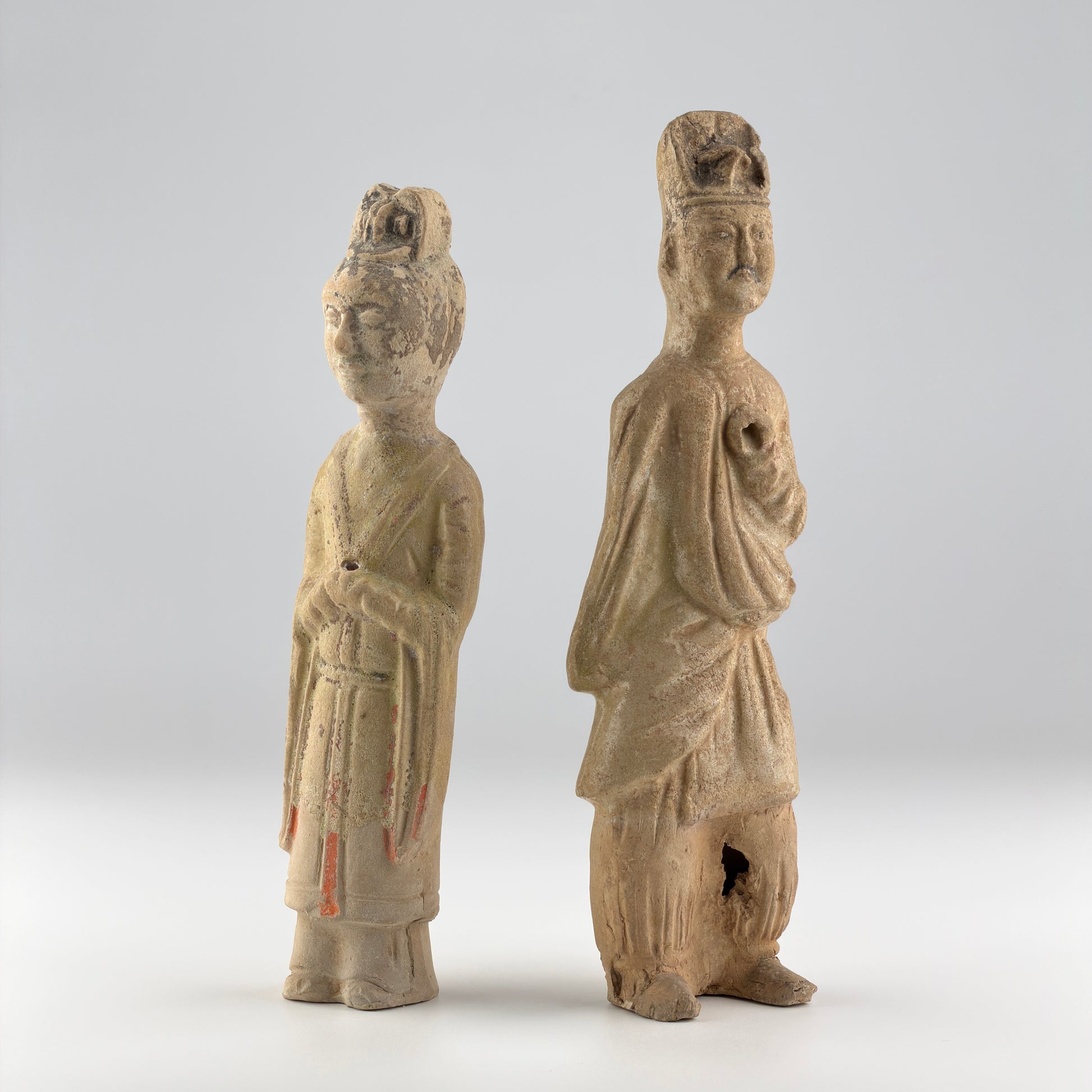 The left figure wears a high chignon and stands with both hands clasped in front, while the right figure wears a tall official cap and holds one arm across the chest. The folds of the robes are rendered with shallow lines, and the lower section of the left figure is hollow, retaining an open vent at the base. Overall surface wear and condition are consistent with age and burial conditions.