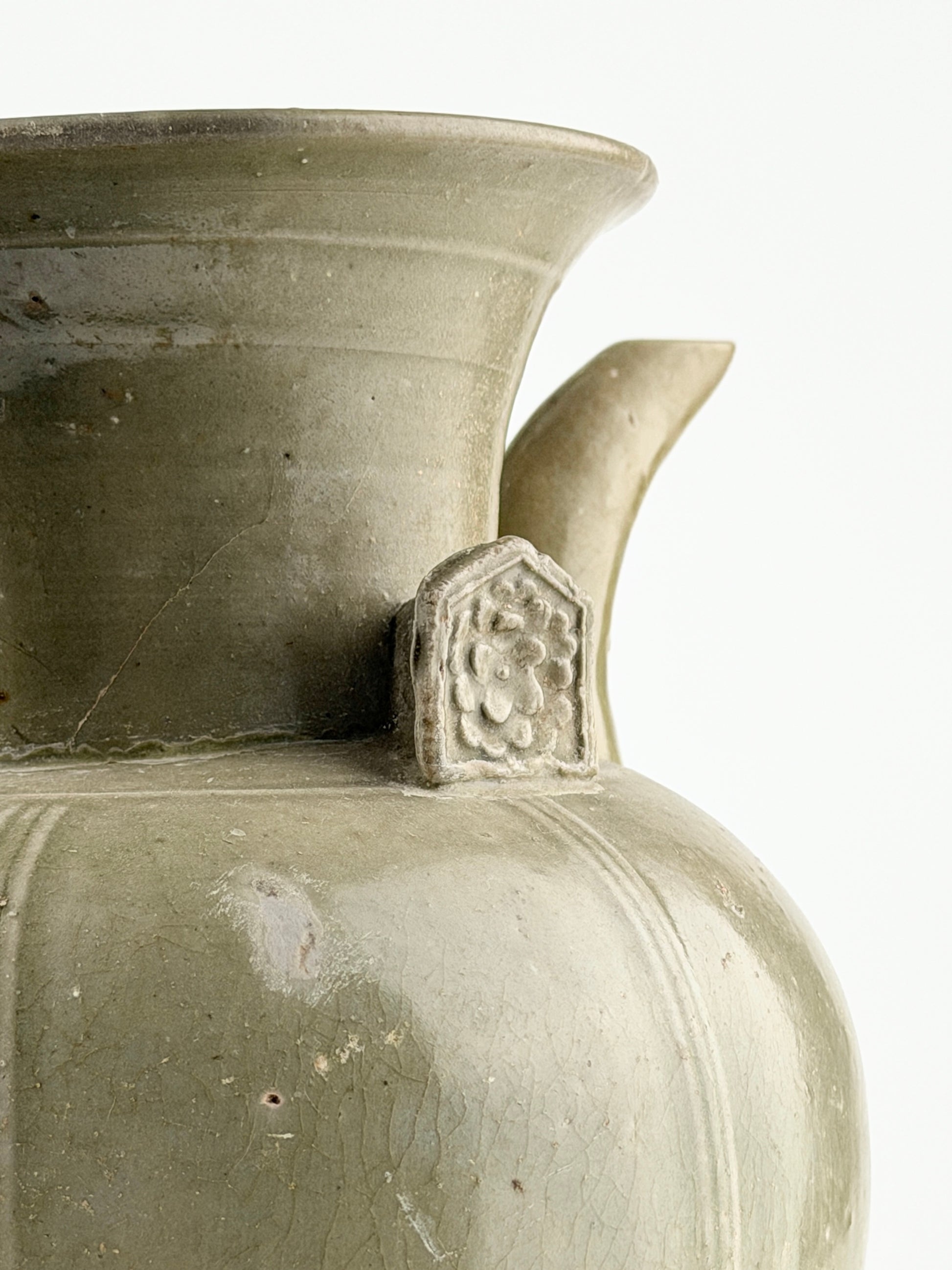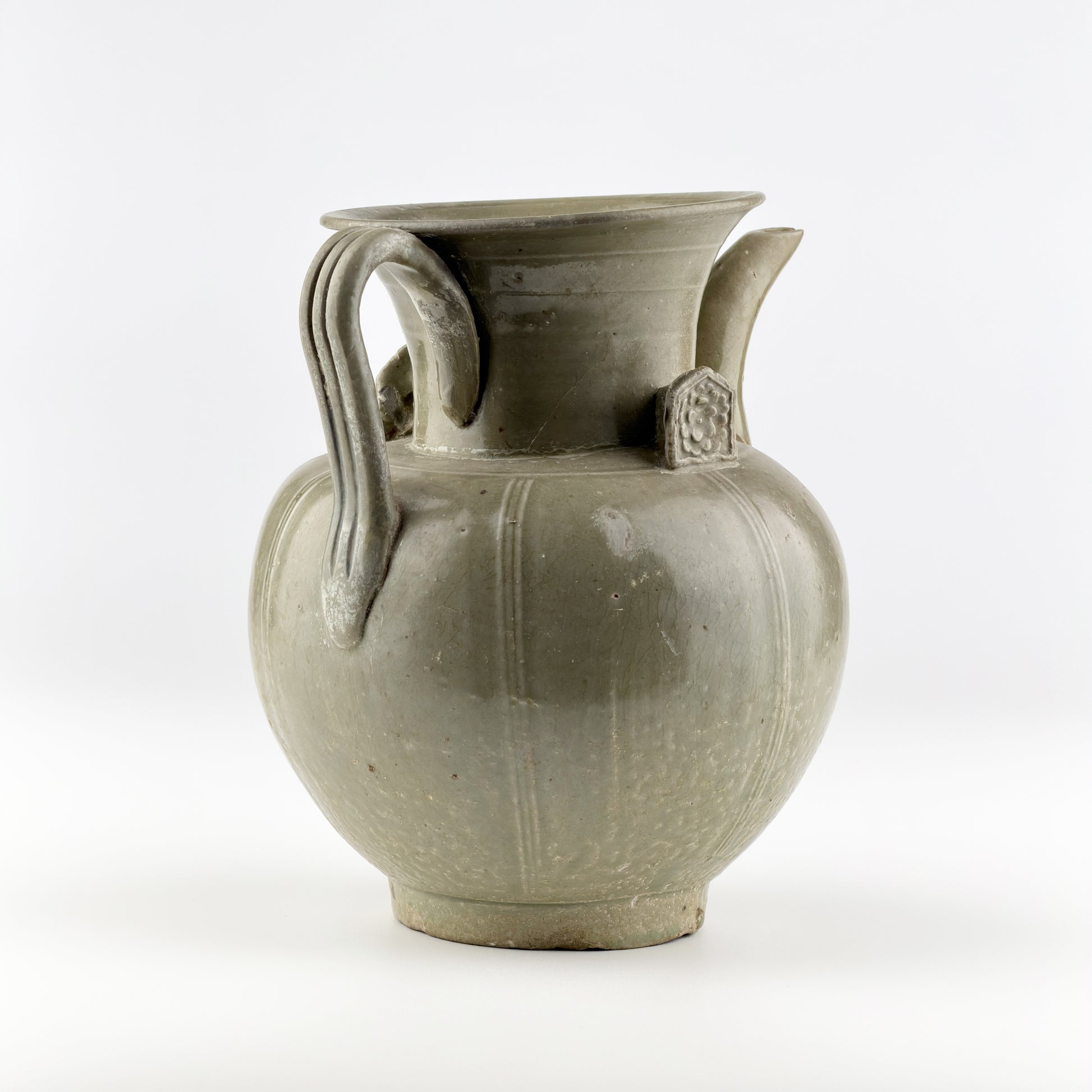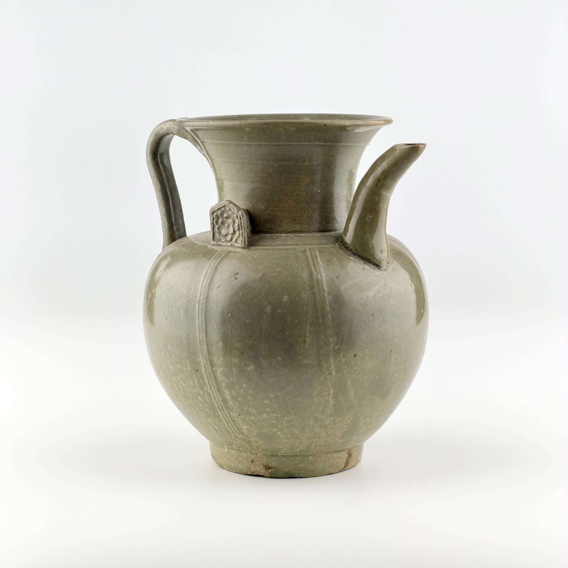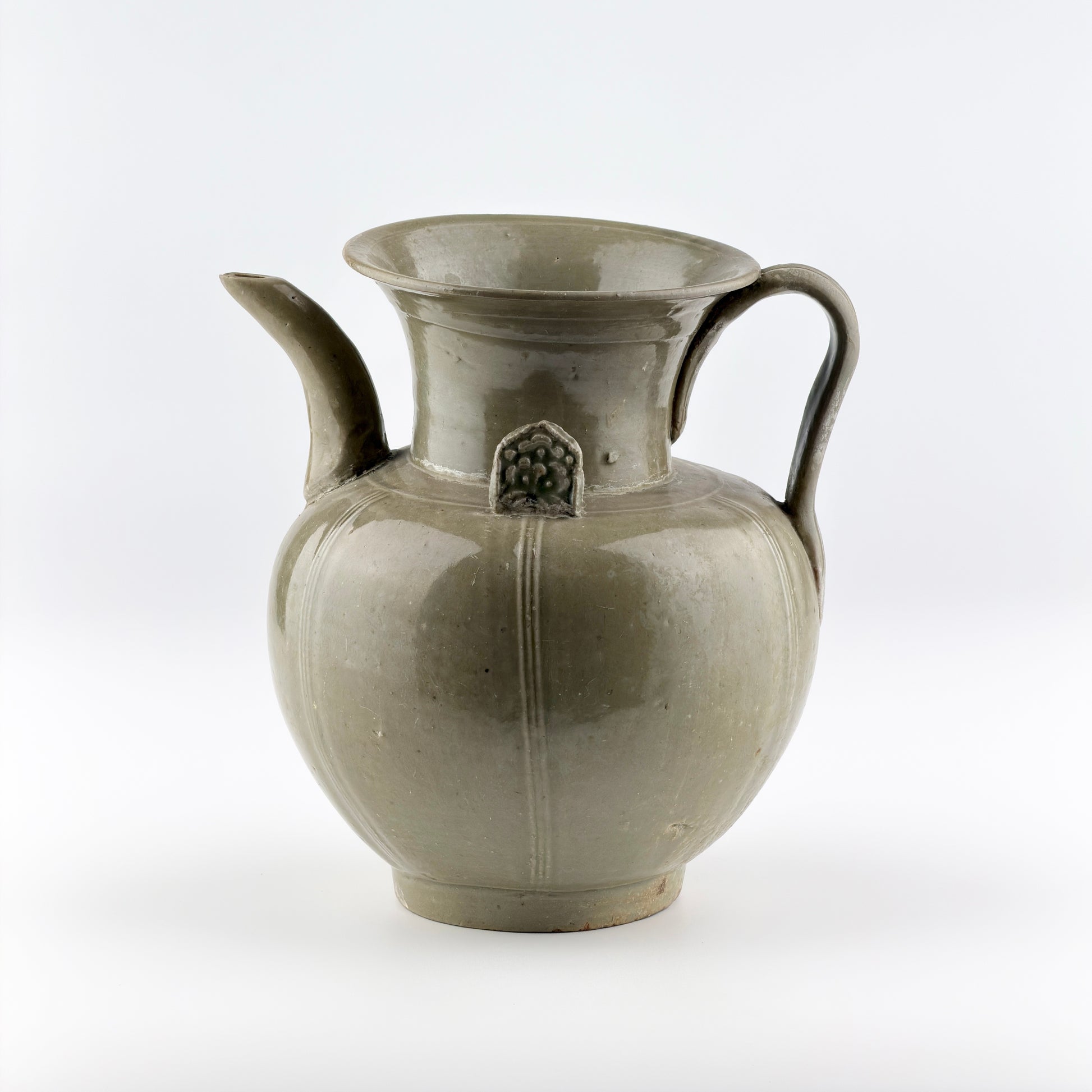 This Yue ware celadon ewer features a softly rounded body rising from a stable foot to a wide, flaring mouth. A translucent olive-green glaze is evenly applied, pooling gently in recessed areas and subtly emphasizing the vertical ribs along the body. The gracefully curved spout and the strap handle extending from the shoulder to the rim create a balanced silhouette, while the floral appliqué at the neck adds a restrained decorative accent. Small pierced lugs on the shoulder suggest that the vessel was once fitted with a lid.